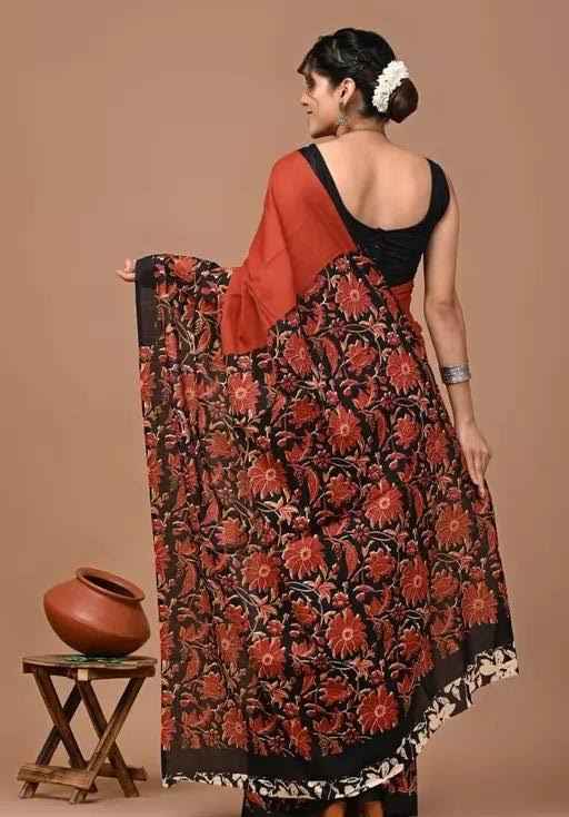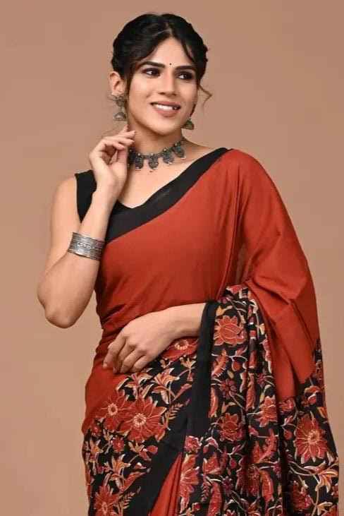 The warm rust base is beautifully offset with a black border and pallu, enhanced by intricate hand-block floral prints in deep, earthy tones. It’s a versatile piece that effortlessly balances heritage charm with everyday sophistication — perfect for festive gatherings, ethnic office wear, or casual celebrations.